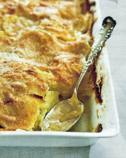 2. Rub a broiler-safe 11X 7 inch baking dish with garlic; discard garlic. Coat dish with butter. Combine milk and next 5 ingredients (through potatoes) in a skillet ; bring to a simmer. Cook 8 minutes or until potatoes are almost tender. Spoon potato mixture into prepared baking dish. Sprinkle with cheeses. Bake at 375 degrees for 35 minutes.