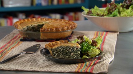 On a lightly floured surface, roll out one disc of dough to a 13-inch circle. Transfer the dough to a 9-inch glass pie plate, allowing the excess dough to hang over the edge of the plate. Trim edges to 1/2 inch. Spread spinach mixture evenly into pie plate. On a lightly floured surface, roll out second disc of dough to a 13-inch circle. Transfer to top of the pie. Trim top crust to overlap the bottom by 1/4 inch. Fold top crust over bottom, and crimp edges together with your fingers. Cut a few small vents. Beat the remaining egg with a few drops of water, and brush over surface of pie. Bake until crust is golden brown, about 1 hour. Cool for 10 minutes before serving.