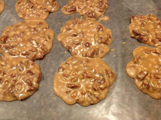 4. Quickly drop by spoonfuls onto the wax paper. (Work quickly, otherwise it will harden too much to spoon out.) Let the pralines cool and set.
