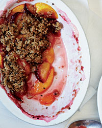 Scrape the fruit into a shallow gratin dish or glass pie plate and sprinkle with the crumbs. Bake in the center of the oven until the fruit is bubbling, about 10 minutes. Let cool for 5 minutes, then serve.