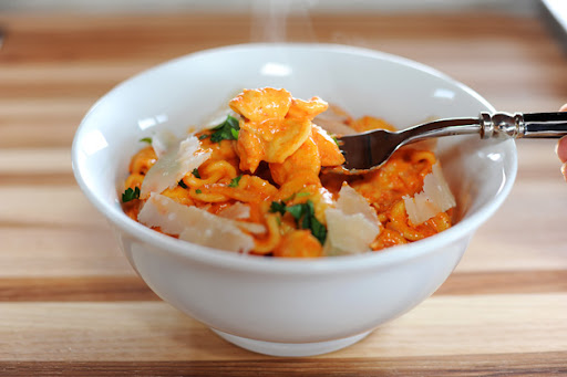 Pour in cream and stir to combine. Taste and add more salt, if necessary. Add cooked pasta, and then stir together.
