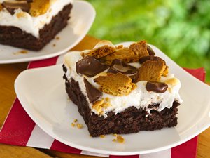 Marshmallows, graham crackers and chocolate bars marry with fudgy brownies for s'more great taste.