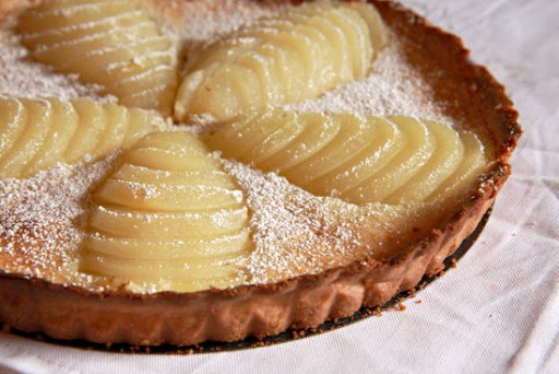 Spread almond filling evenly in crust. Drain canned pears, cut each half crosswise into thin slices. Gently press each pear half to fan slices but keep slices tightly overlapped. Slide spatula under pears and arrange atop filling like spokes of wheel with narrow ends in center.