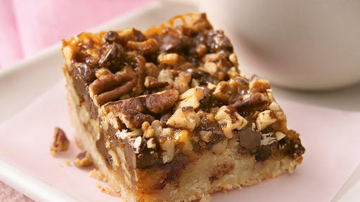 4 Bake 25 to 32 minutes or until edges are deep golden brown and pecans are lightly toasted. Cool on cooling rack 30 minutes; loosen sides from pan, but do not cut. Cool completely, about 3 hours longer. (For firmer bars, let stand an additional 2 hours.) For bars, cut into 6 rows by 4 rows.