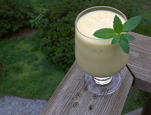 A vegan lassi made with soy yogurt, fresh mint and lemon verbena from my patio garden.