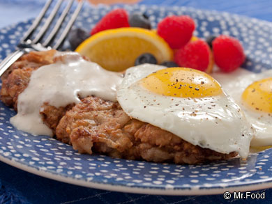 Meanwhile, in a medium skillet, cook eggs sunny-side up in batches. Serve on plate next to steak topped with gravy.