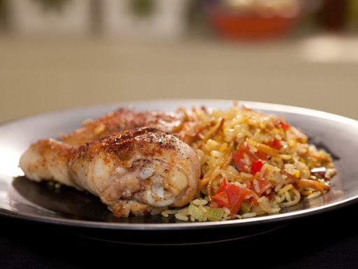 Meanwhile, combine the stock, tomato sauce and remaining teaspoon salt in a medium bowl. Add 1 1/4 cups water and the stock mixture to the skillet and stir to make sure the rice is covered in liquid. Nestle the chicken in the rice, adding any juices from the plate. Bring the rice to a boil. Reduce the heat to medium-low and cover. Cook until the chicken is cooked through, the rice is tender and most of the liquid is absorbed, about 35 minutes. Let the skillet stand covered, about 10 minutes before serving.