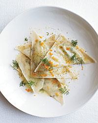 Using wonton wrappers is a great shortcut for making Mario Batali’s tangy herbed goat cheese ravioli.
