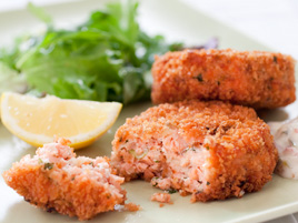 If buying a skin-on salmon fillet, purchase 1 1/3 pounds of fish. This will yield 1 1/4 pounds of fish after skinning. When processing the salmon it is OK to have some pieces that are larger than 1/4 inch. It is important to avoid overprocessing the fish. Serve the salmon cakes with lemon wedges and/or tartar sauce.