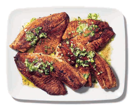 2. Cook the fish: Heat the oil in a large cast iron skillet or saute pan over high heat. Rub the tilapia all over with the blackening seasoning. When the oil in the pan starts to lightly smoke, add the fish and cook undisturbed until the spice rub becomes dark and crusty, 3 to 4 minutes. Flip and cook until the fillets flake with gentle pressure from your finger, 1 to 2 minutes more.