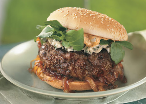 Andouille & Beef Burgers w/Spicy Mayo & Caramelized Onions