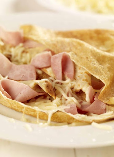 Fill crepes with filling and place crepes in a baking pan. Top with a little Parmesan cheese if desired and bake in oven at 350 for 15 min or until edges of crepes are browned and filling is bubbly. Top with mustard sauce and devour.