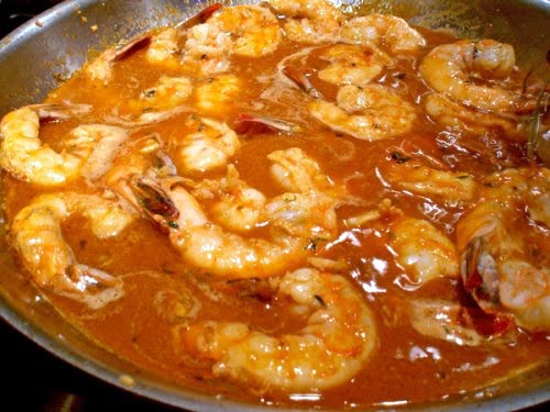 Place the shrimp in a large roasting pan or two casserole dishes – they do not have to be in one layer, as many as will fit in the dish with the sauce is fine. Pour the butter sauce over the shrimp and stir to coat. Place the shrimp in the oven and roast for 45 minutes (they can stay in a bit longer or happily sit for half an hour or so out of the oven if you get distracted with a beer).