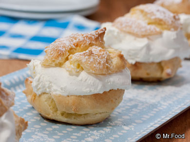 Cut top third off each cooled pastry puff and fill with equal amounts of whipped cream mixture. Replace tops and sprinkle with confectioners' sugar. Serve immediately, or cover and chill until ready to serve.