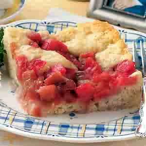 Pour into a greased 9-in. square baking dish. Pour rhubarb mixture over batter. Bake at 350° for 30-35 minutes or until a toothpick inserted near the center comes out clean. Cool on a wire rack. Yield: 9 servings.