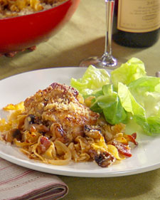 This spin on the traditional French chicken dish incorporates egg noodles, Muenster cheese, and panko breadcrumbs for a hearty one-pan meal. From Mad Hungry