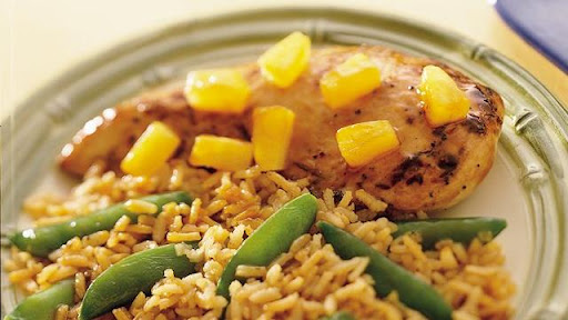 3. Arrange sugar snap peas around edge of skillet. Place chicken over rice; top with pineapple. Cover; cook over medium heat for 6 to 8 minutes or until peas and rice are tender, and chicken is fork-tender and juices run clear.