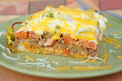 5. On top of biscuit mix, evenly distribute ingredients in the following order: ground beef, tomato slices, green peppers, onions, jalapeno peppers, sour cream mixture and end with remaining shredded cheese.