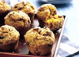 2. In large bowl, mix flour, sugar, baking powder, cinnamon, ginger and salt. Stir in pumpkin, oil, eggs, cranberries and pecans just until moistened. Divide batter evenly among muffin cups. Sprinkle coarse sugar evenly over batter in each cup.