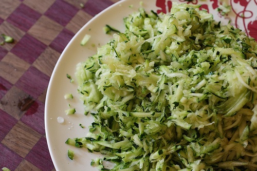 Start by peeling the skin off the zucchini. Next grate it like Alice did, or use mandolin to get them thin and noodle like. Then set zucchini aside on paper towels and add salt so it dries out. I actually ended up squeezing the water out of it like I did for the cauliflower pizza crust but the paper towels feel apart, so be sure to use a dish towel.