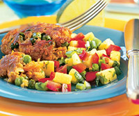 The sweet, earthy flavors of carrots and peas temper the kick of Jamaican jerk seasoning in these Caribbean-inspired patties. For even speedier preparation, use pre-grated carrots, available in most supermarkets. To make fresh breadcrumbs, trim and discard crusts from firm, fresh sandwich bread. Tear bread into pieces, and whirl in a food processor or blender until crumbs form. One slice makes about 1/2 cup. The salsa can be made ahead and kept in the refrigerator for up to 2 days.