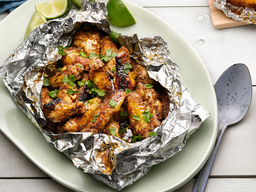 Toss 6 split chicken wings, 1 tablespoon vegetable oil and 3 tablespoons jerk seasoning on a sheet of heavy duty foil. Form a packet. Grill over high heat, turning once, 25 minutes. Top with cilantro and serve with lime wedges.