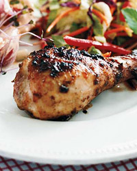 Light a grill. Remove the chicken pieces from the marinade, leaving on a coating of spice paste. Grill the chicken over moderately high heat, turning often, until the skin is nicely charred and the chicken is cooked through, about 30 minutes. Transfer to a platter and serve.