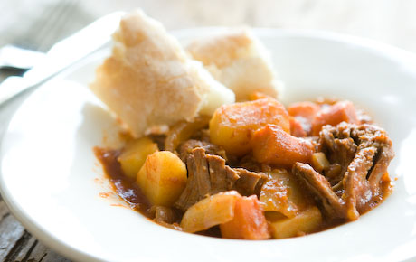 Transfer broth mixture to slow cooker; add onions, carrots, celery, garlic, thyme and bay leaves. Cover and cook until meat is fork tender, on high heat setting for 4-5 hours, on low heat setting 8-9 hours. Discard thyme sprigs and bay leaves before serving.
