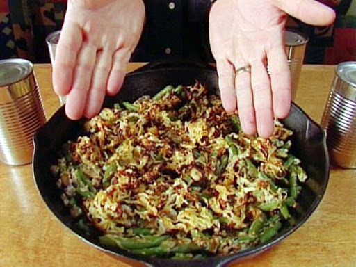 Remove from the heat and stir in 1/4 of the onions and all of the green beans. Top with the remaining onions. Place into the oven and bake until bubbly, approximately 15 minutes. Remove and serve immediately.