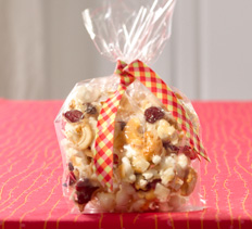 4. Immediately pour over popcorn mixture, quickly stirring to evenly coat; place on baking sheet. Using two forks, gently spread popcorn mixture over foil; sprinkle with salt. Cool completely; break into pieces. Fill cellophane bags for gift-giving or store up to 1 week in an airtight container.