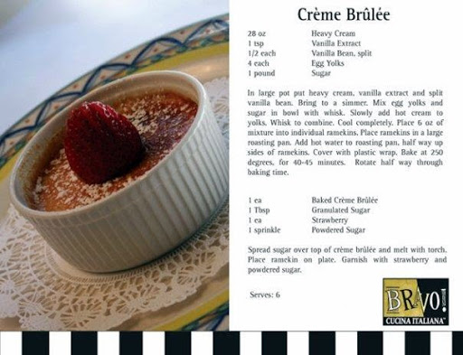 Spread sugar over top of creme brulee and melt with torch. Place ramekin on plate. Garnish with strawberry and powdered sugar.