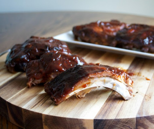 4.Add 1/2 cup water to slow cooker, and put ribs in the slow cooker and put the bbq sauce on at same time.