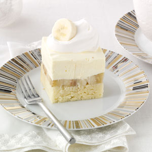 Cut cake into eight slices; arrange on bottom of an ungreased 13-in. x 9-in. dish, trimming to fit as necessary. Slice bananas; arrange over cake. Spread pudding mixture over top. Refrigerate, covered, for 3 hours. Serve with remaining whipped topping. Yield: 15 servings.