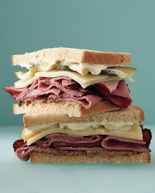 Assemble sandwiches with bread, mustard, pastrami, Swiss, pickles, and mayonnaise.