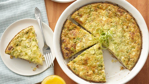 1. Heat oven to 400°F. Grease 9-inch glass pie plate. Sprinkle bacon, cheese and onion into pie plate.