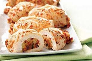 Place 2 chicken breasts in a freezer-weight resealable plastic bag; pound to 1/4-inch thickness. Remove from bag; place, top-sides down, on cutting board. Repeat. Spread chicken with stuffing mixture.