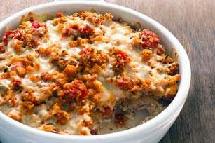 Heat oven to 400°F. Mix tomatoes, stuffing mix, water, and garlic just until stuffing mix is moistened.