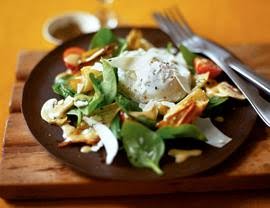 4. Toss spinach with mushrooms, tomatoes, roasted leeks, and dressing in large bowl. Divide salad among 6 dinner plates. Top each serving with 1 poached egg, and garnish with cheese.