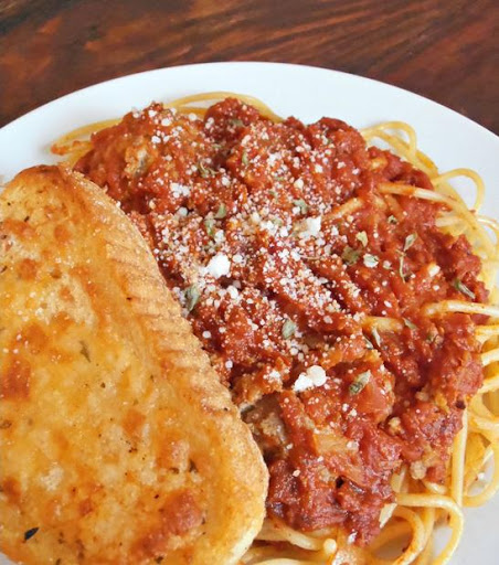2. Blend up the remaining onions and red pepper in a blender or food processor until mostly smooth. Add mixture to the garlic, onions and beef and stir to combine, cooking for another minute. Add tomato paste and spices and cook for 1 minute, stirring until combined. Add tomatoes, beef broth and sugar (and mushrooms, if using). Stir until combined and add the bay leaves.