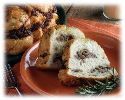Flatten each roll into a 4-inch circle. Place butter in a shallow bowl. Combine herbs and cheese and place in another shallow bowl. Coat each dough circle with butter and then with cheese mixture. Arrange 6 dough circles evenly in a large sprayed bundt pan, to cover the bottom. Circles will overlap. Sprinkle half the cooked sausage over dough. Repeat with 6 more dough circles and the remaining sausage. Add last 6 dough circles to the top to cover sausage. Cover with plastic wrap and let rise until almost double.