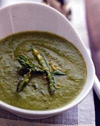 Working in batches, puree the soup in a blender. Return the soup to the saucepan and stir in the lemon juice. Season with salt and white pepper and reheat if necessary. Ladle the soup into bowls and garnish with the asparagus tips and grated lemon zest. Serve hot or chilled.