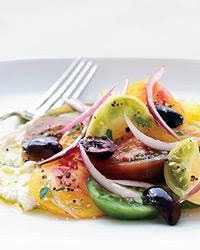 - 2 1/2 pounds mixed heirloom tomatoes, sliced, quartered or halved