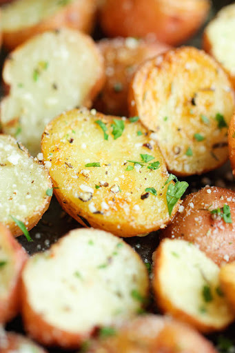 These buttery garlic potatoes are tossed with Parmesan goodness and roasted to crisp-tender perfection!