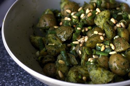 Toss the beans and potatoes with pesto. Stir in vinegar, green onions, pine nuts and season with salt, pepper and/or additional vinegar to taste. Finally, shave some wide flecks of parmesan over the salad with a vegetable peeler.