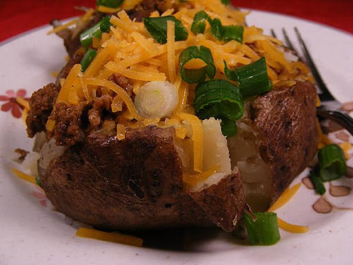 3. With a sharp knife, cut an X in the top of each fresh, hot baked potato. Fluff pulp with a fork.