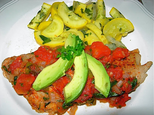 Place seasoned snapper filets in the broiler for about 5-7 minutes on each side. Remove from broiler, place in a baking dish and top with spicy vegetable sauce! Bake for about 10 minutes (350 degrees).... just long enough to cook up a veggie side ... We steamed some yellow squash that we tossed with a sauteed onion and some more fresh cilantro!