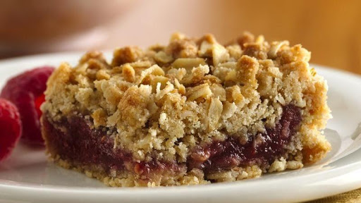 2 Press half of the crumbly mixture in pan. Spread fruit over crumbly mixture to within 1/4 inch of edges. Top with remaining crumbly mixture; press gently into fruit.