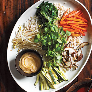 3. Heat a medium nonstick skillet over medium-high heat. Add 1 teaspoon oil to pan; swirl to coat. Add carrot; sauté 2 minutes or until crisp-tender. Remove from pan. Add 1 teaspoon oil and zucchini to pan; sauté 1 minute or until crisp-tender. Remove from pan. Add 1 teaspoon oil and mushrooms to pan; sauté 2 minutes or until tender. Remove from pan. Add 1 teaspoon oil and bean sprouts to pan; sauté 1 minute or until bean sprouts wilt. Remove from pan. Add remaining 1 teaspoon oil and spinach to pan; sauté 1 minute or until spinach wilts. Arrange vegetables in separate piles over rice mixture. Dollop with miso and gochujang; top with microgreens. Sprinkle with sesame seeds. Mix together at the table.