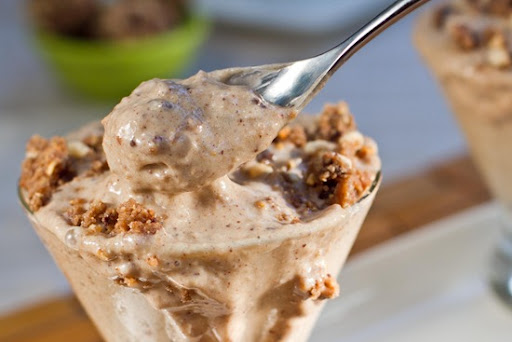 To make this dreamy delight, grab a few frozen bananas and process them in a food processor with a heaping tablespoon of peanut butter. Once the mixture is creamy like soft serve, add in a few peanut butter balls and pulse until chunky. Scoop this mixture into a small glass and top with crumbled cookie dough balls. Serves 2.