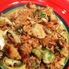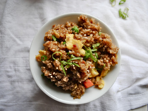 Lower heat to low & stir in rice, butter, garlic powder, peas, carrots & soy sauce until fully incorporated.